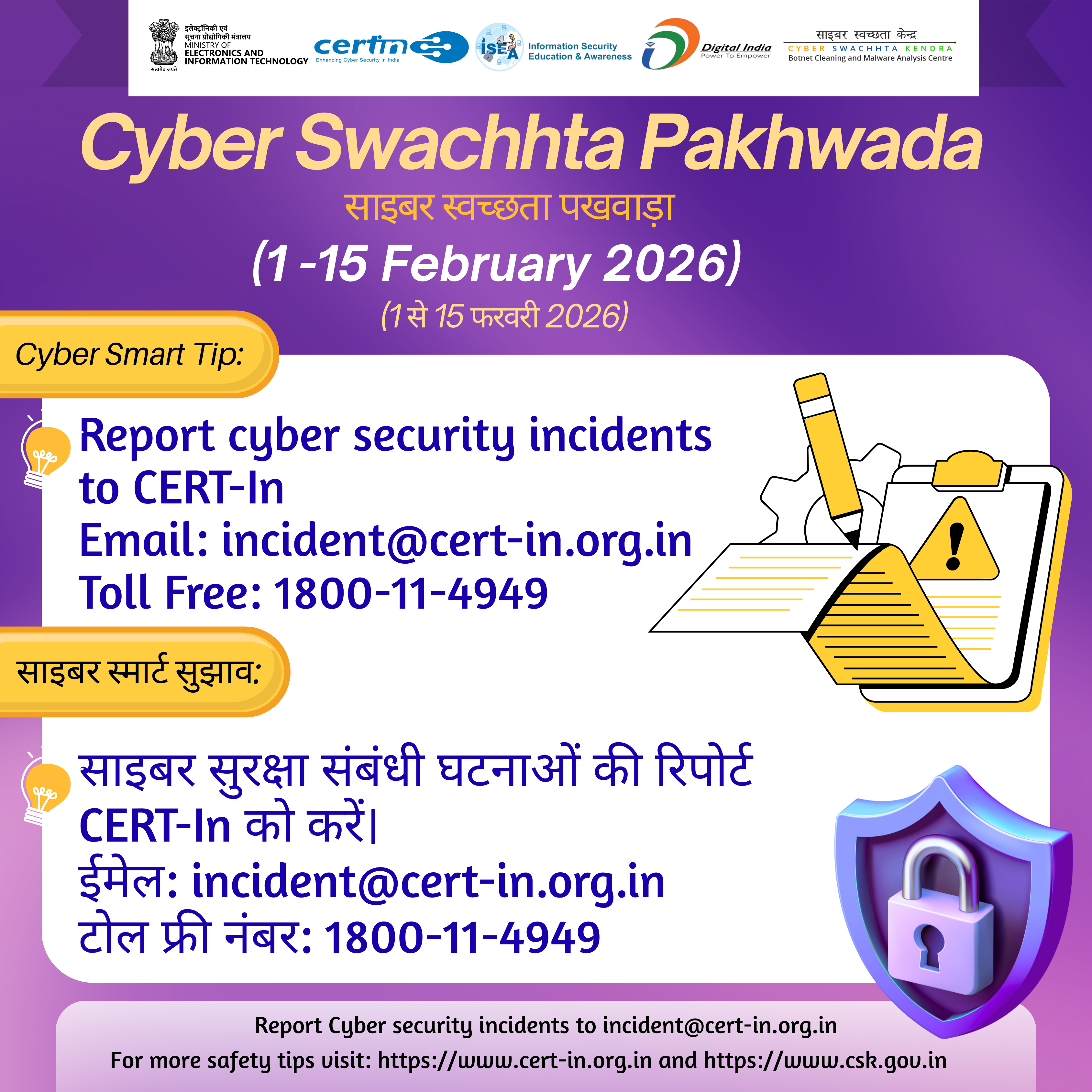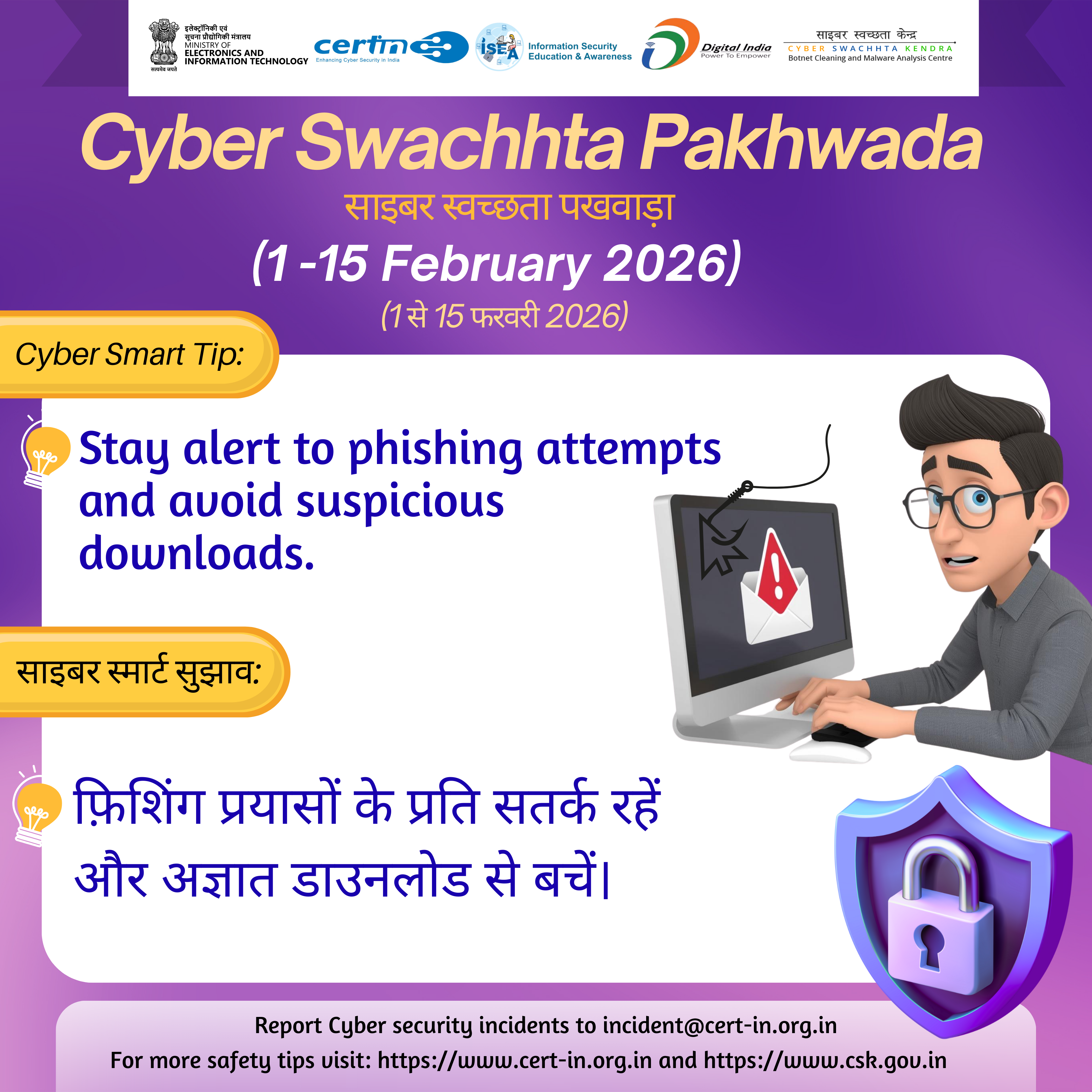 सीईआरटी-इन, 01 - 15 फरवरी 2026 के दौरान नागरिकों के बीच साइबर स्वच्छता के बारे में जागरूकता पैदा करने के लिए "साइबर स्वच्छता पखवाड़ा" मना रहा है।